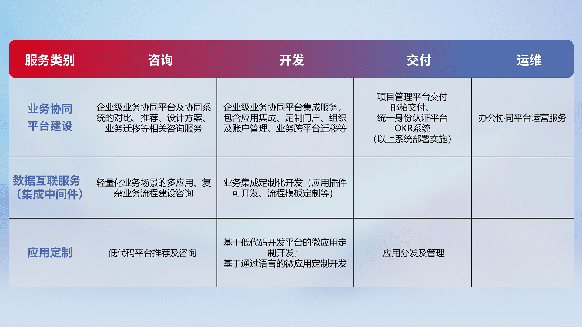 针对钉钉、、、、企微、、、IDaas等平台级产品提供产品的规划、、方案、、、交付、、定制化开发等服务,,,,实现如统一协同办公、、智能客户服务、、混合会议管理、、、智能数据查询、、、等业务场景,,实现数字化转型。。