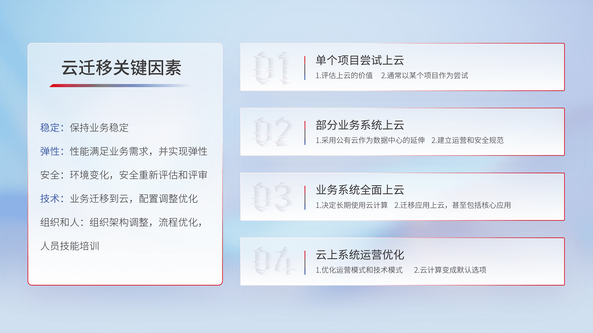 结合实际业务,,,,从规划设计、、、、云平台选型、、、云原生改造、、、数据迁移、、、、集成交付,,,迁移全过程为客户识别最佳上云路径,,做好风险识别管理,,设计网络架构、、身份权限、、、、安全审计合规、、操作审计、、、日志审计、、、监控告警策略、、、、多站点容灾设计等,,对云上基础设施进行整体规划,,提升IT治理水平,,,,以满足弹性、、、、高可用、、高性能的需求。。
