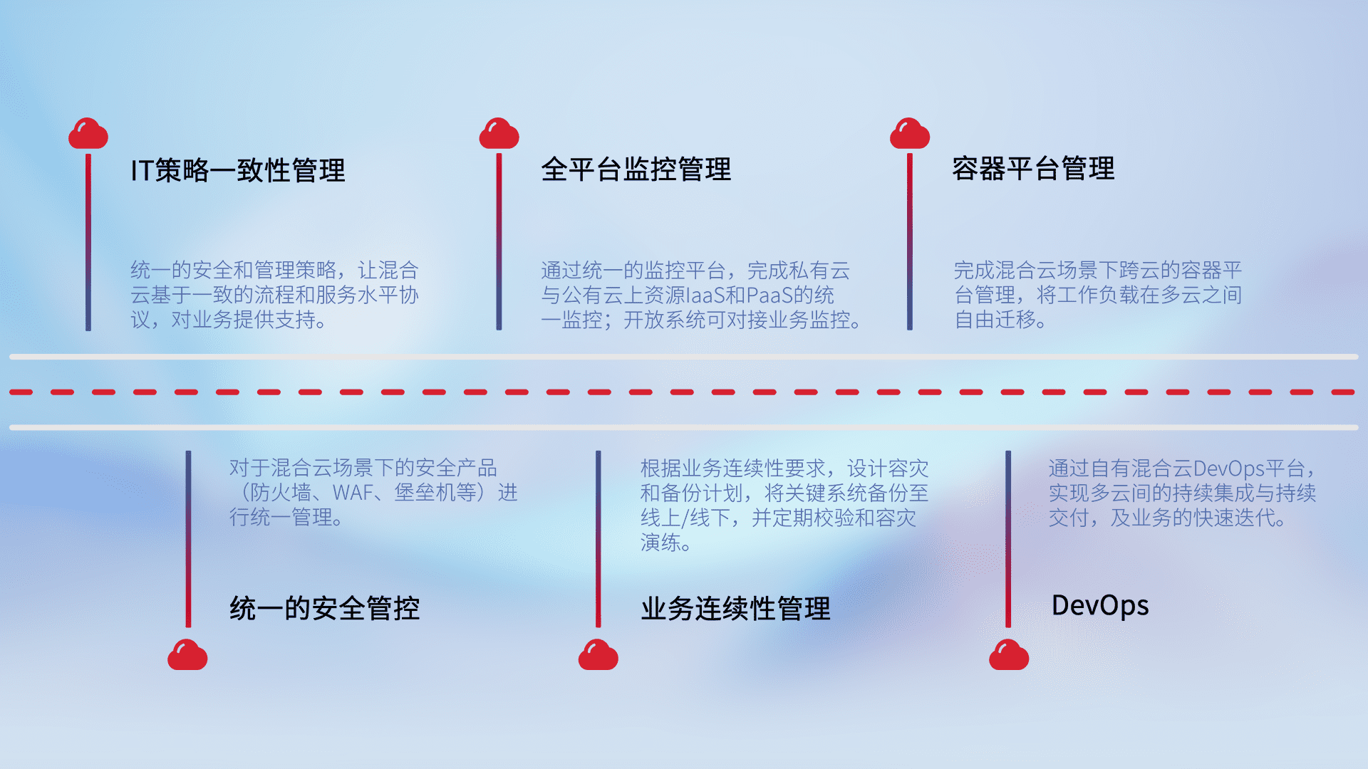 通过多云纳管,,,以统一的资源数据模型把客户的云资源进行抽象和封装,,,,进而实现对多云资源的统一操作,,保障云资源管理的可靠性、、、稳定性与可用性。。。。量身定制化运维内容,,,,配置、、开发运维、、、、补丁管理、、、、备份、、监控、、、认证和访问管理、、、、审计和日常巡检等,,保障在用云过程中的可靠度,,,稳定度以及高可用率。。。。